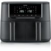 The Severin FR2463 air fryer is an appliance designed for those seeking healthy and efficient cooking. This air fryer features a total capacity of 8 liters, divided into a dual-basket design that allows cooking two types of food simultaneously, optimizing time and offering versatility for preparing various dishes. Its 2600W power ensures fast heating and efficient hot air circulation, contributing to even and crispy cooking without the need for large amounts of oil. The FR2463 includes 10 preset programs that simplify selecting the best cooking mode depending on the food type, from potatoes and chicken to fish or desserts, adapting to different culinary needs with ease. Its black finish provides a modern and elegant look that fits easily into any kitchen. Additionally, it comes with a European (EU) plug, suitable for electrical standards in Spain and other European countries. This air fryer is a practical solution for those wanting to reduce fat intake without sacrificing the traditional taste and texture of fried foods, combining technology and functionality in a robust and versatile appliance. In short, the Severin FR2463 Air Fryer offers an efficient way to cook healthily, conveniently, and with consistent results.