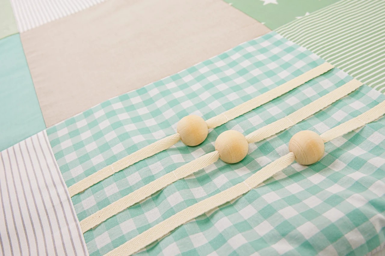 • Interactive elements on the mat edges: squeaky toy pocket, wooden buttons, crinkling shapes, and baby mirror