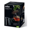 The Braun WK500BK Multiquick 5 electric kettle is a device designed to provide efficiency and safety when preparing hot water at home. This model stands out for its 1.7-liter capacity, allowing you to boil an adequate amount for multiple uses, from making infusions to cooking. Its black plastic construction offers lightness and durability, making it easy to handle while maintaining a sleek, modern design. It features a fast boiling system that can reach 100 °C in just 35 seconds, significantly speeding up the process compared to conventional kettles. Additionally, it includes a removable and washable anti-scale filter, which helps keep water pure and extends the appliance’s lifespan by preventing limescale buildup. Safety is a key aspect, as it incorporates a quadruple safety system that automatically switches off the kettle when the water boils, if there is no water, if the lid is open, or after use, avoiding risks related to overheating or malfunction. It operates at a 220 V voltage and comes with a European plug, suitable for most homes in Spain and Europe. This kettle also features a wide spout that makes filling directly from the tap easy, combining convenience and speed. Its automatic shut-off system allows for safer and more practical use, ideal for those seeking a reliable appliance that combines functionality with effective safety measures. In short, the Braun WK500BK kettle is a solid, well-equipped solution for anyone wanting to heat water quickly and safely, with a responsive design and features aimed at facilitating daily use.