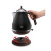 The KBOV 2001.BK kettle from DeLonghi is a kitchen appliance designed to provide efficiency and ease in heating water with a maximum power of 2000 W. It has a 1.7-liter capacity, suitable for quickly and flexibly preparing several cups of hot water. Its structure is made of stainless steel, offering durability and strength, featuring an elegant matte black design with bronze accents, ideal for fitting into any contemporary kitchen setting. This kettle operates at a voltage of 220-240 V, compatible with most European household electrical systems. Among its technical features, it stands out for the automatic shut-off system, which ensures safety by cutting power once the water reaches boiling point, preventing overheating. Additionally, its cordless design promotes greater comfort and freedom of movement by allowing the base to be separated from the kettle body for easy filling and pouring without restrictions. This device is ideal for users seeking a robust kettle with good performance and an elegant finish, providing reliability for daily use without sacrificing a distinctive style touch. Overall, the DeLonghi KBOV 2001.BK kettle offers a practical and functional solution for the quick preparation of infusions and other hot beverages, balancing capacity, power, and design.